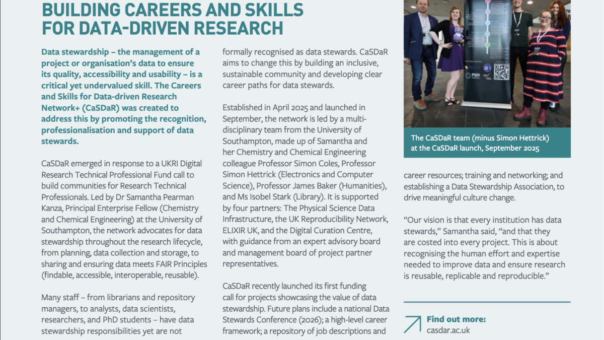 Recently, our principal investigator’s work was recognised by our organisation, who put a spotlight on the development of CaSDaR in a recent issue of their magazine that had a focus on research culture initiatives.